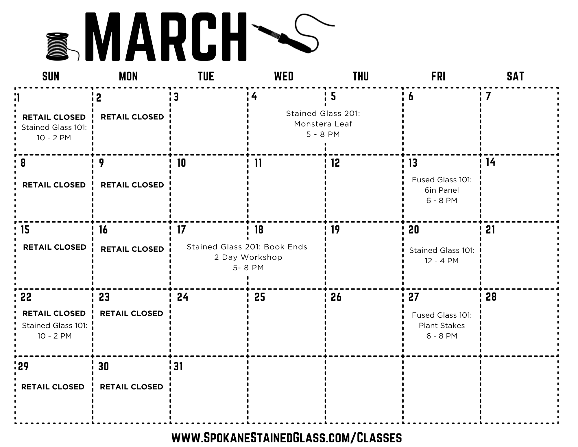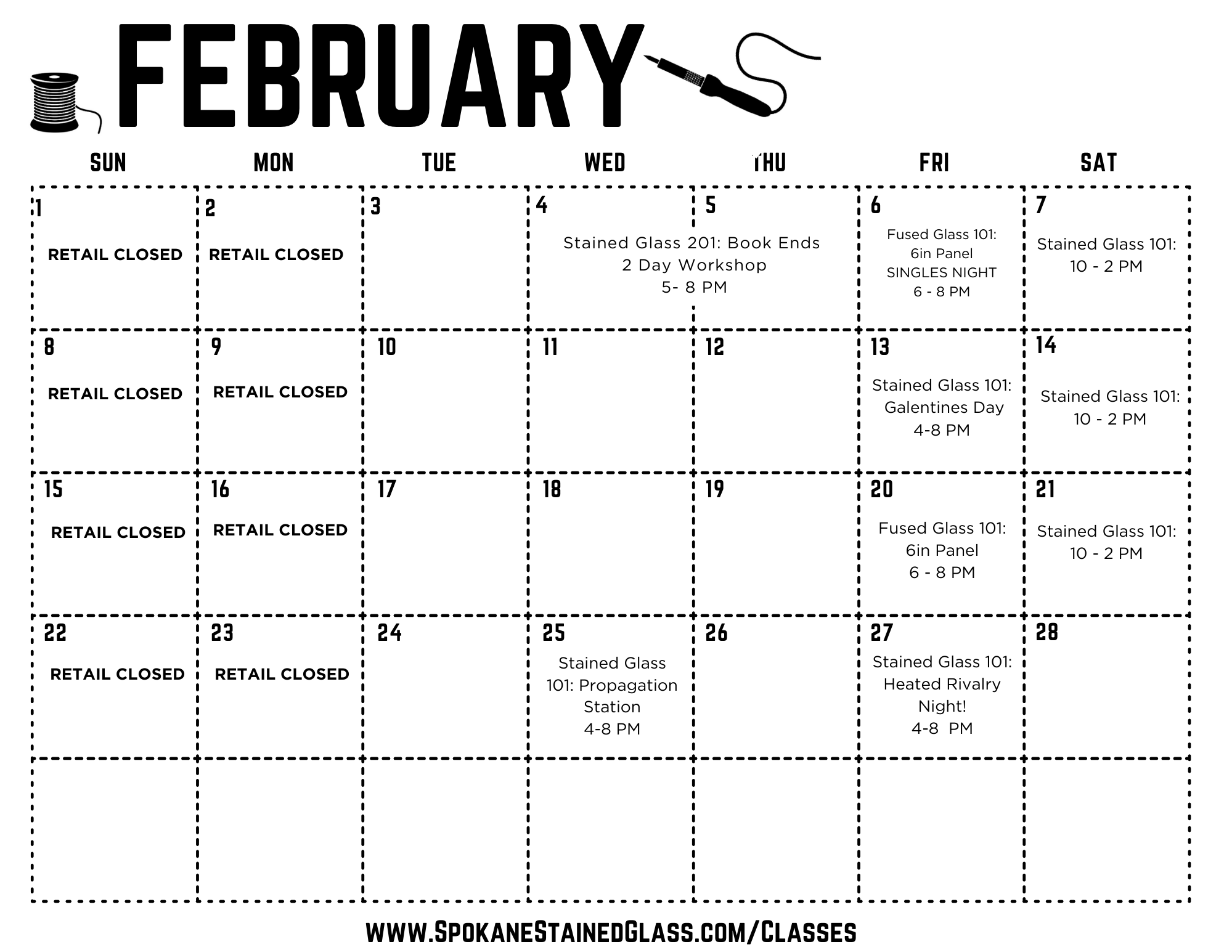 All classes take place at our Spokane studio at 2901 N Argonne Rd. Tools and materials are provided.